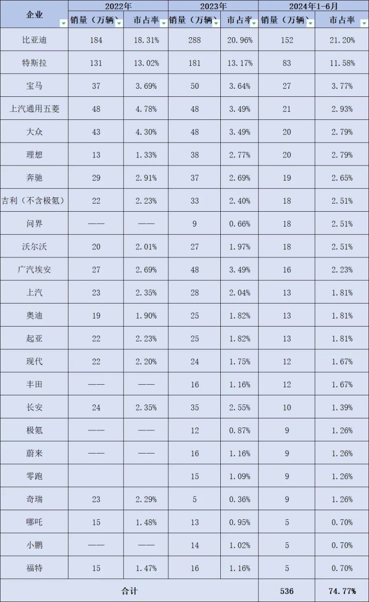 在全球汽车市场,新能源车正以不可阻挡之势席卷而来。2024年上半年,全球新能源车销量超700万辆,同比增长约23%,市占率高达18%。尤为引人注目的是,中国品牌在全球新能源车市场中的表现尤为抢眼,不仅占据了TOP20强中的12席,更有6家企业跻身前十强,整体市占率约69%。比亚迪以152万辆的销量成为全球最畅销的新能源汽车品牌,这不仅是中国品牌的骄傲,更是全球绿色出行时代的先锋。