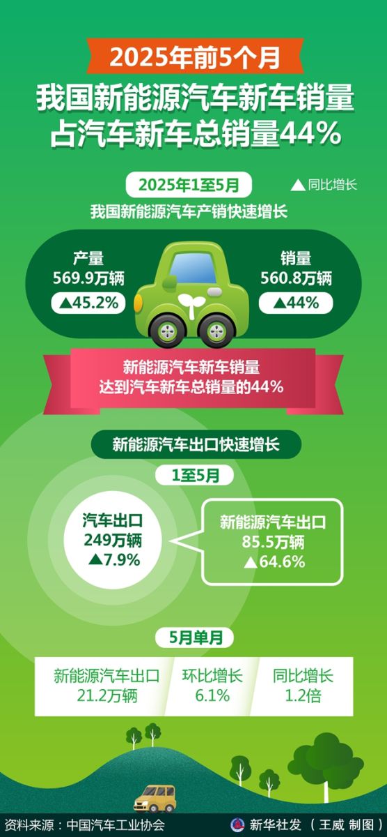 记者11日从中国汽车工业协会获悉,2025年1至5月,我国新能源汽车产销快速增长,分别完成569.9万辆和560.8万辆,同比分别增长45.2%和44%,新能源汽车新车销量达到汽车新车总销量的44%。