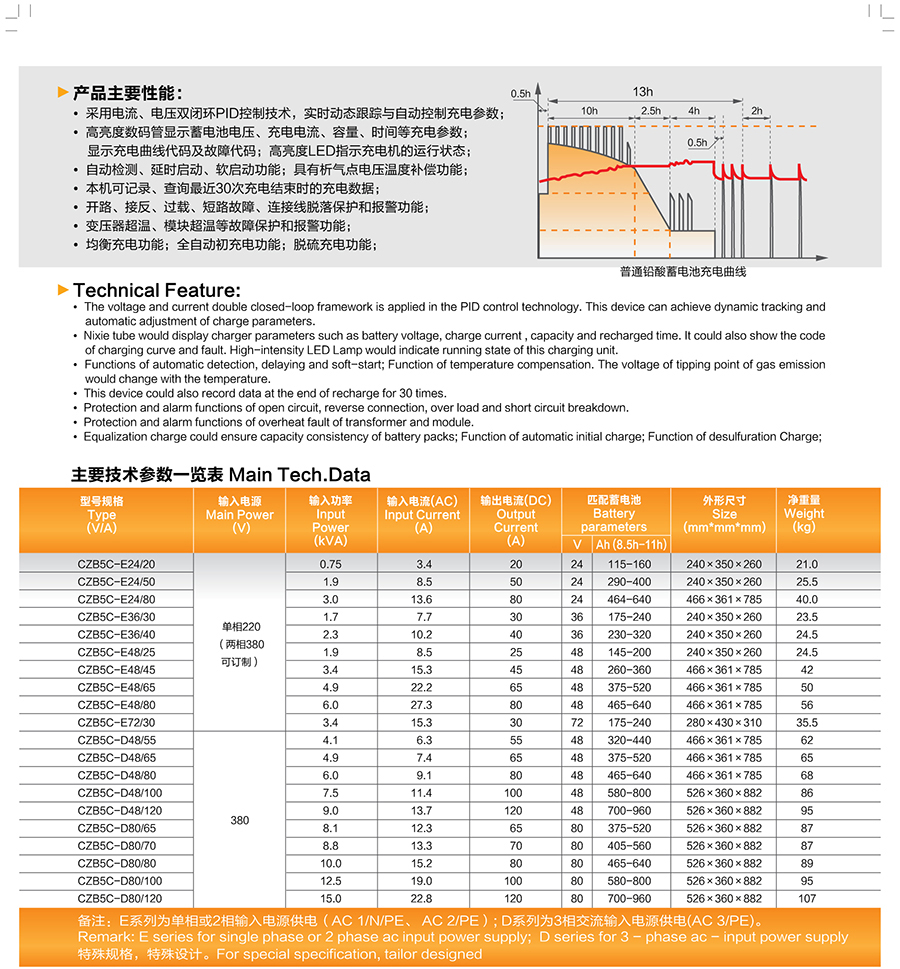 CZB5C系列充电机通过漏磁变压器、可控硅整流技术及微机控制技术相应地结合,实现优化Wsa+Pulse充电特性曲线,充电电流随蓄电池充电电压的升高而自动下降。同时在析气点前及充电末期加入脉冲充电方式,在保证蓄电池电量充足的前提下,较好的降低了充电过程中蓄电池内部的温度及析气,有效延长蓄电池组的充放电循环使用寿命。使充电效果更为理想,充电效率更高。产品具有结构简单、操作方便、功能齐全、充电效率高等特点以及完善的保护功能。