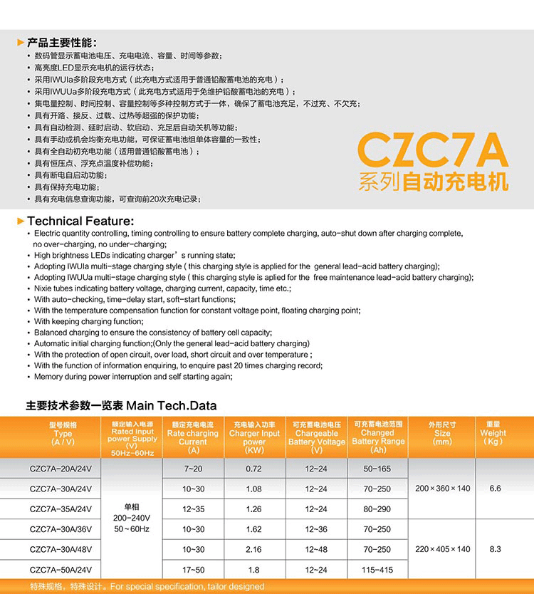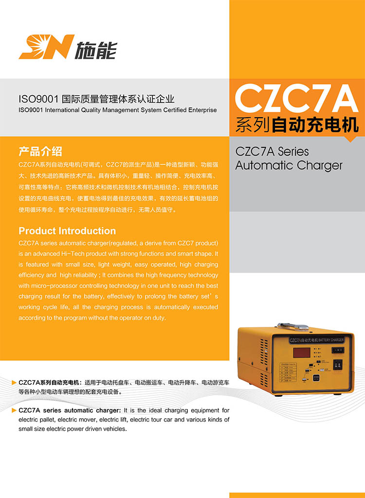 CZC7A系列自动充电机(可调式,CZC7的派生产品)是一种造型新颖、功能强大、技术先进的高新技术产品。具有体积小,重量轻、操作简便、充电效率高、可靠性高等特点:它将高频技术和微机控制技术有机地相结合,控制充电机按设置的充电曲线充电,使蓄电池得到最佳的充电效果,有效的延长蓄电池组的使用循环寿命,整个充电过程按程序自动进行,无需人员值守。